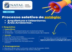 Natal: TJRN divulga lista de classificados em seleção de estágio de pós-graduação em Direito Natal/RN – A Secretaria de Administração do Tribunal de Justiça do Rio Grande do Norte (TJRN) divulgou, no Diário de […]